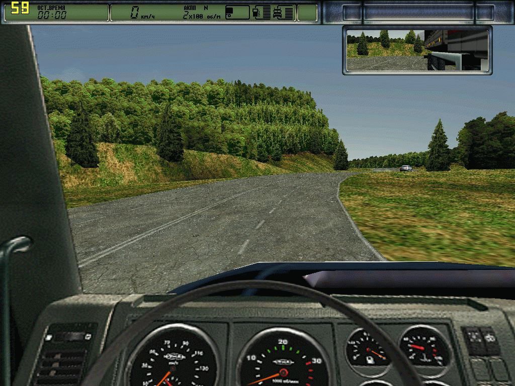 Машина ведет себя очень реалистично, насколько это было возможным в 1998 году. Самое главное – вождение живое, грузовик трясет, качает, камеру уходит то вверх, то вниз. Ряды елок по обои краям дороги дают какое-то представление о местности, где мы находимся. Выглядит все это по современным меркам не очень, но для своего времени игра просто великолепная.