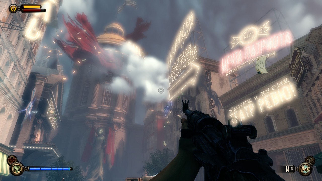 Несмотря на ряд характерных особенностей этого цифрового проекта, которые собственно и отличают его от многих других, делая уникальным, особенно выделяется именно сюжет, который лично для мене, является самой сильной стороной этого проекта. Итак, в игре BioShock Infinite, нам поведают историю детектива Букера ДеВитта, которого в один прекрасный день, доставляют на остров с маяком, который располагается неподалеку от побережья штата Мэн, делают это два человека, которые собственно и заказали детективные услуги у этого человека. Они обещают простить ему все его былые долги, но взамен, они просят нашего главного героя, разыскать девушку по имени Элизабет, которую, последний раз, видели поблизости этого маяка. В скором времени, он оказывается внутри этого маяка, потихоньку он поднимается по лестнице и достигает самой высокой точки этого сооружения, там он обнаруживает таинственный механизм, пользуясь которым, он оказывается в таинственном городе под названием Колумбия, который буквально парит в небесах. Спустя некоторое, достаточное короткое время, наш главный герой вступает в конфликт с местными властями, которые после того, как обнаружили на его руке символы "AD", которые по сути, представляют собой инициалы местного "Ложного пастыря", начинают самую настоящую охоту за нашим главным героем. Вследствие этиой охоты, ему приходится сражаться со своими врагами. Наверное именно за счет этого, он обнаруживает, что на территории этого города, он может похвастаться наличием особых умений, которые делают его практически неуязвимым для многих местных "представителей правоохранительных органов". Совсем скоро, он обнаруживает ту личность, ради которой он собственно и оказался на территории этого города - молодую девушку Элизабет, которая, что странно, оказывает некое сопротивление нашему главному герою, которая особо проявилась во время того, как он сообщил, что собирается доставить ее к двум личностям, которые собственно и заказали его услуги.