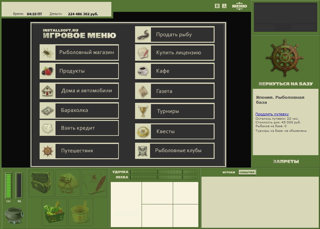 - Снаряжение и удочки. Все это имеет смысл, как и в реальной жизни. Нельзя на тонкую удочку поймать тяжелого карася. Поэтому для каждой рыбалки вам нужно подобрать то снаряжение, что позволит поймать максимально возможный улов.