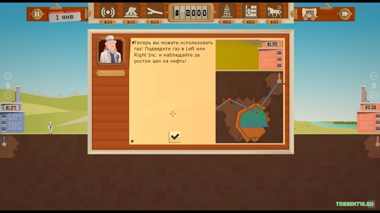 Стать нефтяным монополистом предлагает вам новая аркадная стратегия. События игры навеяны лихорадкой, виной которой стала нефть. Так что приготовьтесь отправиться в девятнадцатое столетие в Северную Америку, чтобы там добывать ценный продукт, который впоследствии можно будет продавать на черном рынке. Чтобы стать успешным магнатом такого бизнеса, в первую очередь вы должны взять в аренду участки земли, чтобы там начать добывать нефть. Естественно вам потребуется рабочая сила. Нанимать вы будете бурильщиков, которым необходимо будет построить жилые дома. В игре Turmoil, скачать торрент на русском которой возможно совершенно бесплатно, если вы посетите наш сайт, вам предстоит развивать свои нефтяные наделы. Но чтобы добывать нефть, вам нужны бурильные установки, вам придется рыть скважины. Найдя правильный участок, можно там установить вышку и добывать нефть. Вы также сможете посещать аукционы, чтобы там покупать акции у своих конкурентов. Как видите, чтобы добиться своего, вам нужно постараться не только продавать нефть, но еще и построить хранилища. Такой ценный продукт всегда востребован, особенно во времена нефтяной лихорадки. Очень увлекательная стратегия, версия которой уже успешно переведена на русский язык!