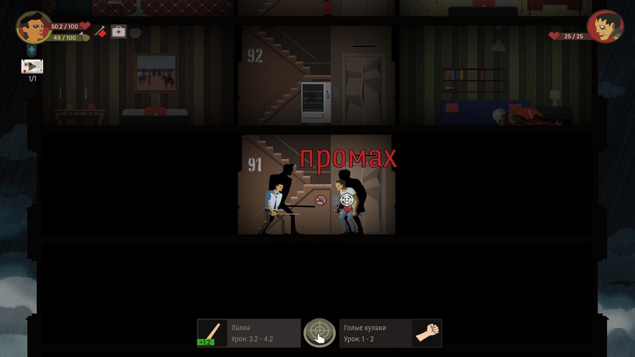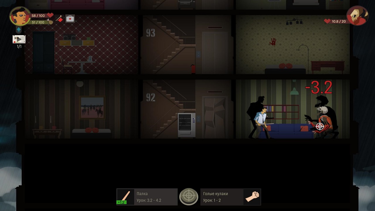 Олдскульную сложность демонстрирует нам Skyhill. Ваша задача проста как хозяйственное мыло, нам всего лишь нужно спуститься на первый этаж гостиницы, а начинаем мы с сотого. На каждом из них по две комнаты, одна справа, другая слева. При всей простоте основного задания, выполнить его довольно сложно. Итак, как уже говорилось, начинаем мы с последнего этажа, именно там находится наша комната. В ней расположен верстак для крафта и кровать, а также лифт, но он есть на любом этаже, правда работает далеко не на всех. В комнатах и лестничных пролетах вам будут встречаться разные монстры и маньяки, с которыми придется драться. Вот тут то и начинает чувствоваться настоящая сложность. Как правило, все противники сносят очень много здоровья, а восстанавливать его практически нечем.